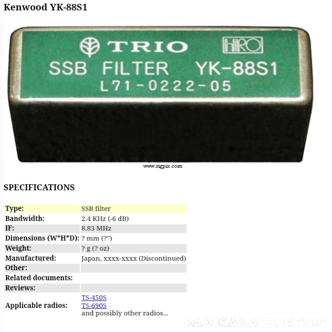 Filtre Trio Kenwood SSB 2,4 kHz YK-88S-1 excellent état de présentation et de fonctionnement, proche du neuf. Fonctionne avec KENWOOD TS450 TS570 TS690 TS850 TS930 TS940 TS950 TS950SDX etc... Prix 75€