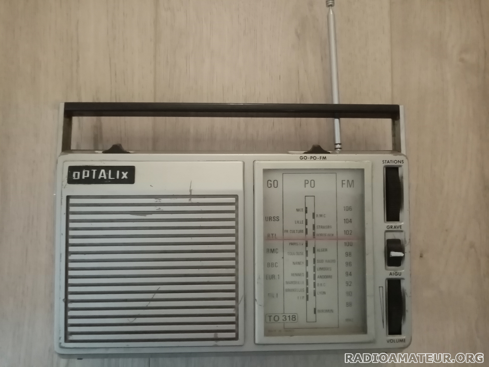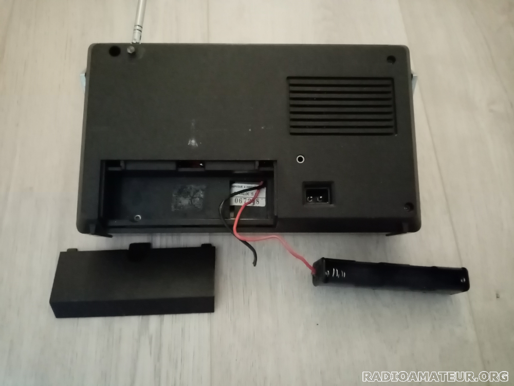 Façade marquée. Nécessite un petit point de soudure entre le câble d'alimentation négatif et le ressort du logement à piles. Equipé d'un poignée Fonctionne avec quatre piles 1,5 V AA. Reçoit la FM, en plus des GO et PO. Bouton tonalité HS. 950 g 24,8 x 14,1 x 5,2 cm plus la poignée