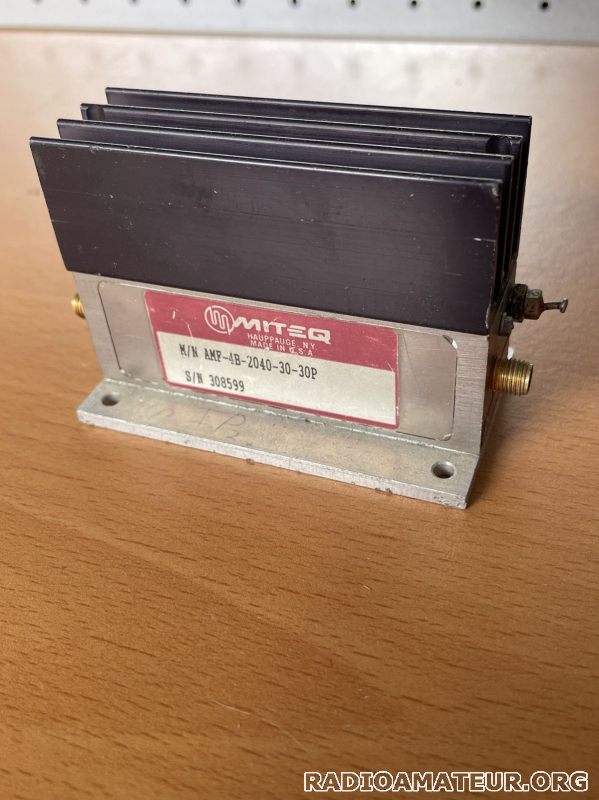 - Ampli 2-4 GHz MITEQ Pout 30 dBm AMF-4B-2040-30-30P avec refroidisseur : 250 euros - Ampli 800 MHz-3 GHz MITEQ Pout 24 dBm AMF-4D-008030-15-24P-E avec refroidisseur : 200 euros - Ampli 2-6 GHz MITEQ Pout 33 dBm AMF-3B-02000600-80-33P avec refroidisseur : 300 euros - Ampli 2-6 GHz MITEQ Pout 33 dBm AMF-4B-02000600-70-33P avec refroidisseur : 350 euros - Ampli 100 MHz-8 GHz MITEQ Pout 23 dBm AMF-3D-001080-40-23P avec refroidisseur : 250 euros - Ampli 500 MHz-2 GHz MITEQ Pout 33 dBm AMF-4F-005020-40-33P avec refroidisseur : 200 euros - Ampli 6,8 - 7,1 GHz 30 dBm MITEQ (perfos au-delà de la spéc de fréq) AMF-3B-6871-30P avec refroidisseur : 100 euros (utilisable à 5,76 GHz) - Ampli 50-2000 MHz G=19 dB AVANTEK Pout +26 dBm 250 mA APG-2050M avec refroidisseur : 150 euros - Ampli 50-2000 MHz G=27 dB Pout +27 dBm 300 mA avec refroidisseur : 170 euros Frais de port à prévoir selon quantité.